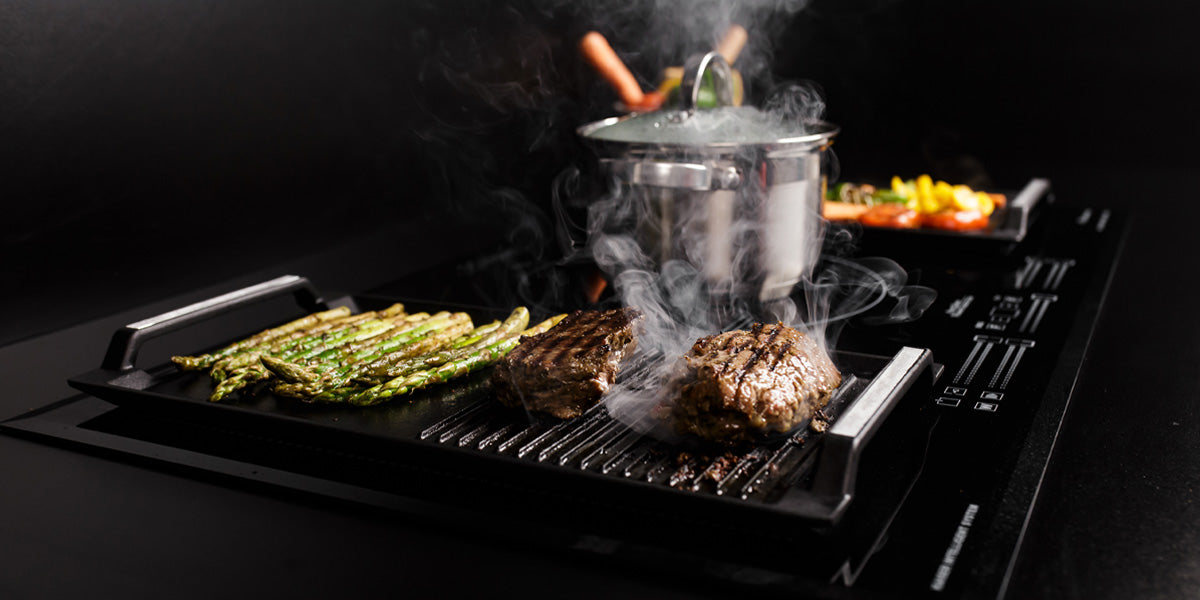 Induction hobs with Free-Zone heating elements allow the cookware to be placed arbitrarily, without worrying about the number and size. The Barbecue and Teppan Yaki features allow you to experiment in your kitchen. In barbecue mode, the food is cooked for a long time at a temperature of ~180 °C.