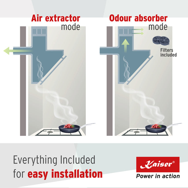 It is not always possible to connect the fume extractor hood to the ventilation system. In this case, the extractor hoods by Kaiser can operate as a filtering system. The metal grease filter absorbs the fatty constituents and other tiny particles from the cooking vapours first, then the odorous substances and micro particles are directed through the activated charcoal filter. The cooking vapours and fumes return, purified, into the kitchen.