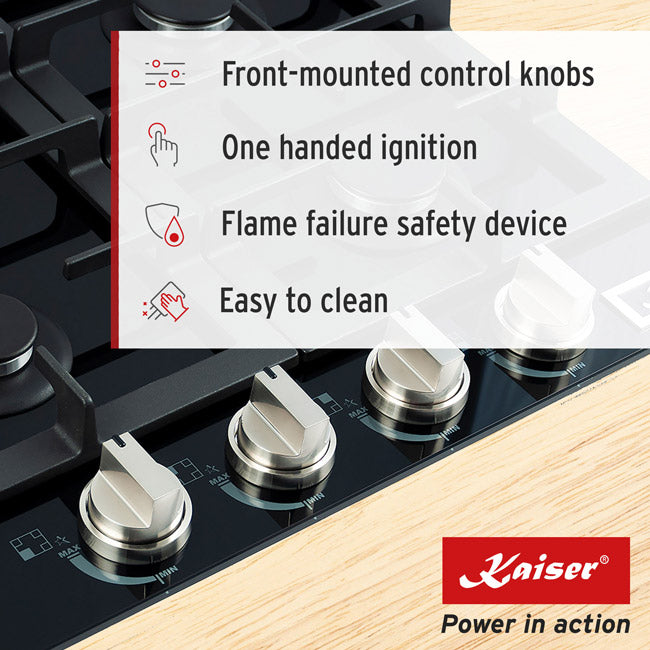 All Kaiser gas appliances are equipped with our automatic pilotless ignition. Simply turn the sturdy metal knobs to ignite any of the reliable burners. And, of course, our control knobs are front-mounted so you don't need to reach over any naked flames. Your safety is always of paramount importance. This is why we also have our flame failure safety device, which will cut off the gas supply automatically in the event the flame is unexpectedly extinguished.