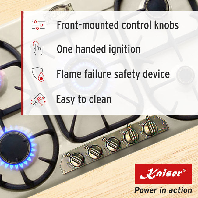 All Kaiser gas appliances are equipped with our automatic pilotless ignition. Simply turn the elegant bronze metal knobs to ignite any of the reliable burners. And, of course, our control knobs are front-mounted so you don't need to reach over any naked flames. Your safety is always of paramount importance. This is why we also have our flame failure safety device, which will cut off the gas supply automatically in the event the flame is unexpectedly extinguished.