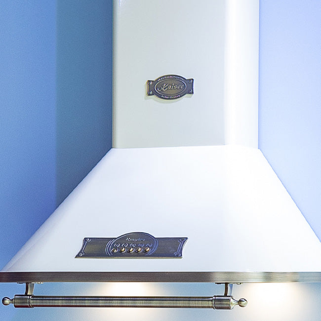 The A 6315 ElfEm Eco cooker hood is a statement piece that balances practicality with traditional charm. Finished in classic ivory enamel and accented with polished brass trim, it captures the essence of Empire design while offering reliable everyday performance. Measuring 60cm in width, it’s ideally suited to standard cooktops, and its powerful motor achieves up to 910 m³/h of extraction, ensuring your kitchen remains free of smoke, steam, and lingering odours.