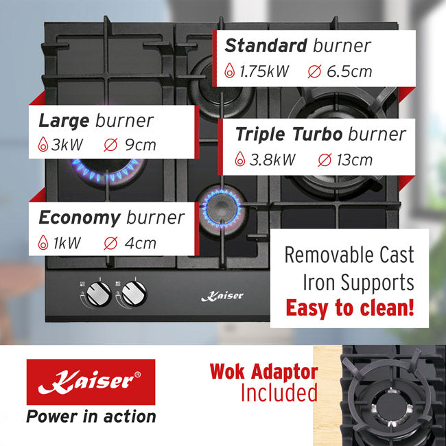 This hob features 4 gas burners; a triple Turbo burner, a large burner, a standard burner & a smaller economy burner. Due to the optimised layout of these burners, there is a greater capacity for cooking space than you get from a standard 2x2 layout from similar-sized cooktops. This allows you to cook with a variety of pots & pans at the same time for perfect results when cooking meals for your family & friends. A wok adapter is also included with your purchase. This is best utilised on the triple Turbo burner, but you can use it on any burner of your choice.