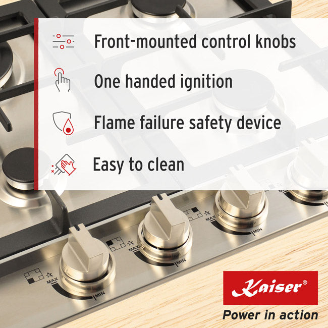 All Kaiser gas appliances are equipped with our automatic pilotless ignition. Simply turn the sturdy knobs to ignite any of the reliable burners. And, of course, our control knobs are front-mounted so you don't need to reach over any naked flames. Your safety is always of paramount importance. This is why we also have our flame failure safety device, which will cut off the gas supply automatically in the event the flame is unexpectedly extinguished.
